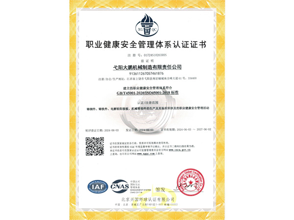 公司順利通過質量管理體系認證、環境體系認證、職業健康安全管理體系認證、環評。2015年5月獲國家工信委頒發的《鑄造企業準入條件》;2019年做了安全現狀評價;2020年取得了排污許可證。